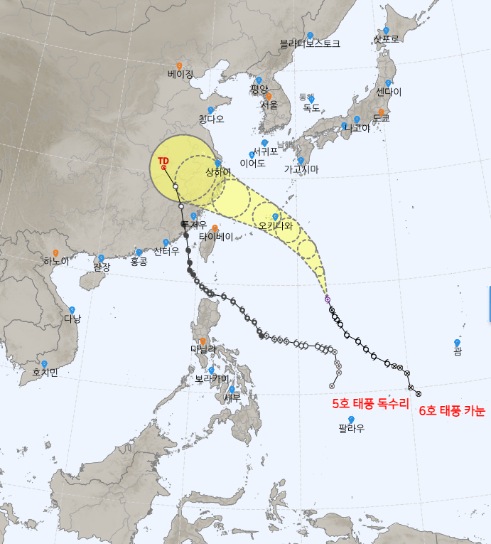 다음 태풍인 6호 태풍 '카눈'은 중국 태풍 적색경보에 따라 8월 2일 중국 상하이 남남서쪽 약 210㎜ 부근으로 진입할 전망이며, 기존의 5호 태풍 '독수리'는 24시간 이내에 약화될 것으로 예상됩니다.