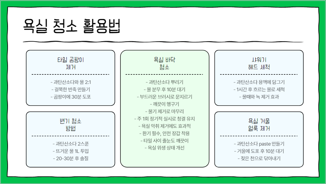 욕실은 높은 습도로 인해 곰팡이가 쉽게 번식하는 공간입니다. 과탄산소다는 곰팡이를 제거하면서도 환경에 해를 끼치지 않아 안전하게 사용할 수 있습니다.