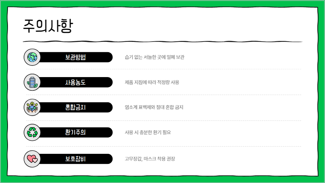 - 혼합 금지: 염소계 제품(락스 등)과 혼합하면 유해한 가스가 발생할 수 있으므로 함께 사용하지 마세요.
